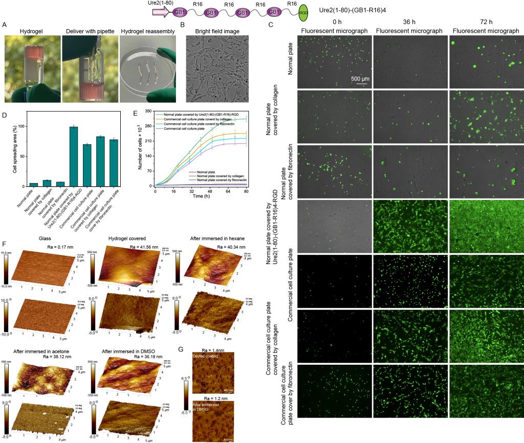 图3 超分子弹性蛋白水凝胶具有极强的细胞粘附特性。将其涂抹于任何物体表面即可使得该物体成为优良的细胞培养材料,可以用于培养肌肉干细胞,促进细胞粘附、增殖、分化及三维培养。