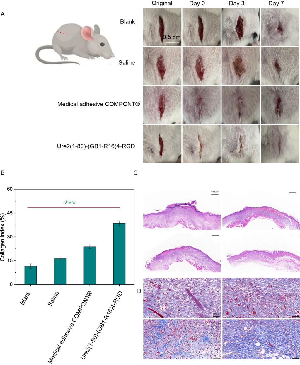 图4 超分子水凝胶促进圆形伤口的组织再生,第三天即可恢复62.5%的皮肤组织。