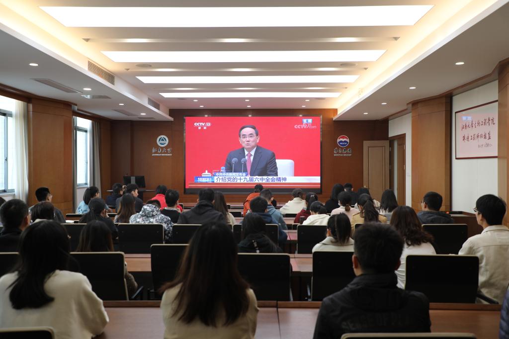 11月12日上午,welcome皇冠地址登录入口组织师生党员代表在茅台厅收看了关于党的十九届六中全会新闻发布会直播,学院党委书记王维、院长许正宏,院领导周云龙、聂尧、陈献忠等参加了学习。