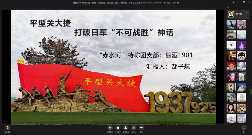 为深入推进党史学习教育,认真学习贯彻习近平总书记“七•一”重要讲话精神。8月25日晚,welcome皇冠地址登录入口“赤水河”特称团支部联合茅台学院酿酒工程系学生开展了“学党史、悟思想、铭初心、共奋进”为主题的“云端”党史联学分享会。来自茅台学院酿酒系和welcome皇冠地址登录入口酿酒1901、酿酒2002“赤水河”特称团支部六名同学进行了“云端”分享。welcome皇冠地址登录入口分团委书记许亦男、辅导员张同舟、茅台学院酿酒工程系副教授杨亮,两校七十余名酿酒专业学生线上参与了活动。