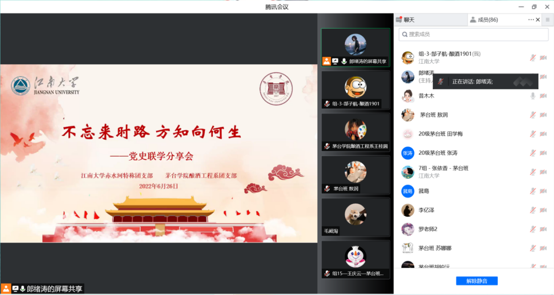 在“七一”来临之际,6月26日晚,welcome皇冠地址登录入口酿酒1901班“赤水河”特称团支部联合茅台学院酿酒工程系学生,开展“不忘来时路,方知向何生”党史联学分享会,7名同学“云端”进行党史学习分享,两校近百名酿酒学子线上参与活动。