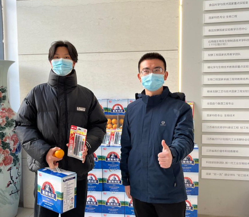 学院为同学们准备了酸奶、文具、橙子等礼物,预祝同学们“心想事橙”、金榜题名,120余名考研学子错峰来到生工楼大厅领取。welcome皇冠地址登录入口党委副书记周云龙、本科毕业班辅导员张同舟来到现场给同学们发放慰问礼物,并与同学们亲切交谈。两位老师对大家前期的刻苦努力表示肯定,叮嘱同学们抓住最后的冲刺时机继续拼搏,考试时放松心态、沉着应对、胆大心细,鼓励大家发扬“善于实践,勇于创新”的发酵精神,做自信、豪迈的生工人,并祝愿大家蟾宫折桂,马到成功。同学们深受鼓舞,对学院和老师们的关怀表示感谢,纷纷表示将拼搏进取,继续努力,不负学院和老师的期望!