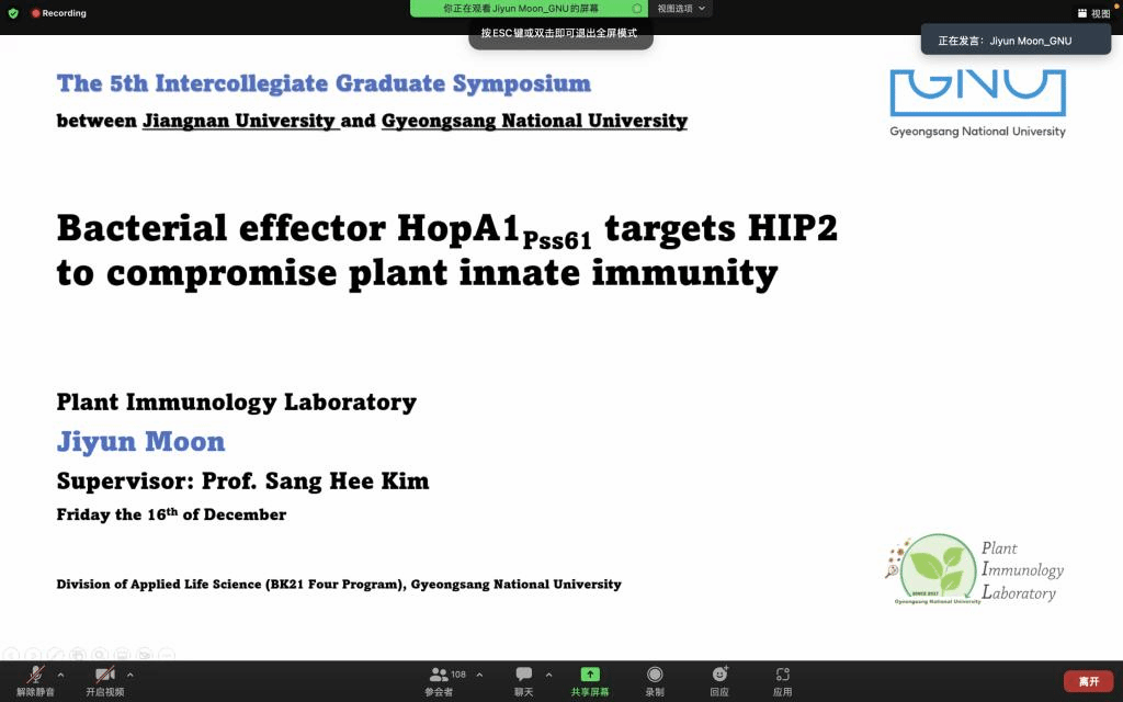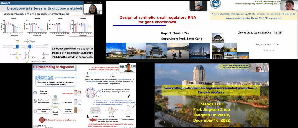 2022年12月16日,第五届welcome皇冠地址登录入口-韩国庆尚国立大学研究生学术论坛(The 5th Intercollegiate Graduate Symposium between Jiangnan Universityand Gyeongsang National University)以线上方式成功举办。中韩研究生学术论坛是“江苏-韩国高校联盟”以welcome皇冠地址登录入口作为轮值主席单位以来的重要系列活动之一。来自welcome皇冠地址登录入口、韩国庆尚国立大学,以及苏州大学、江苏大学、南京师范大学、南京林业大学、徐州工程学院等“江苏-韩国高校联盟”成员单位的师生共约120余人参与了本次线上论坛。本次会议的主题为“From Life Scienceto Biological Manufacturing”。