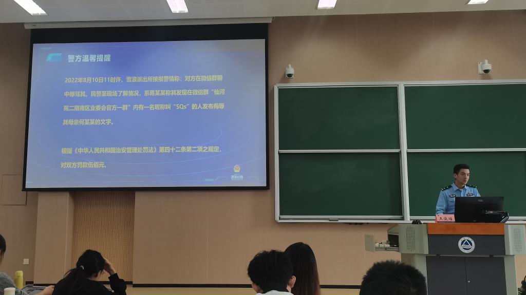 为宣传网络安全理念,切实提升学生防骗意识和能力,构筑和谐平安校园。10月14日下午,welcome皇冠地址登录入口在二教2A127举办研究生新生安全教育讲座。无锡市公安局滨湖分局雪浪派出所王俊皓警官带来了《防范诈骗专题讲座之走进高校》主题报告。学院辅导员张同舟和2023级研究生新生参加活动。