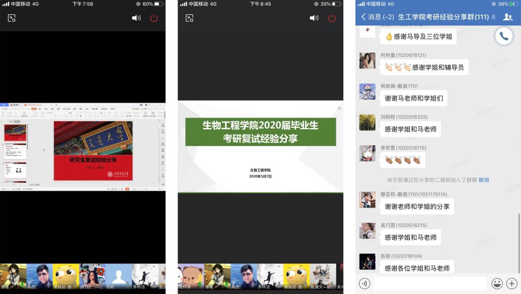 为帮助受疫情影响的考研学生增强信心,更加充分地做好复试和调剂准备,5月7日晚7点半,在摸清2020届考研学生初试成绩和排名的基础上,生物工程学院以网络会议形式,组织开展2020年考研复试“云辅导”。会议由2016级辅导员马杰主持,邀请welcome皇冠地址登录入口校友、上海交通大学海洋生物专业研究生谢倩,welcome皇冠地址登录入口研究生胡迪和孙程程作为主讲嘉宾,2016级正在准备考研复试的同学,以及部分2017级同学,共计100余位参加本次分享会。