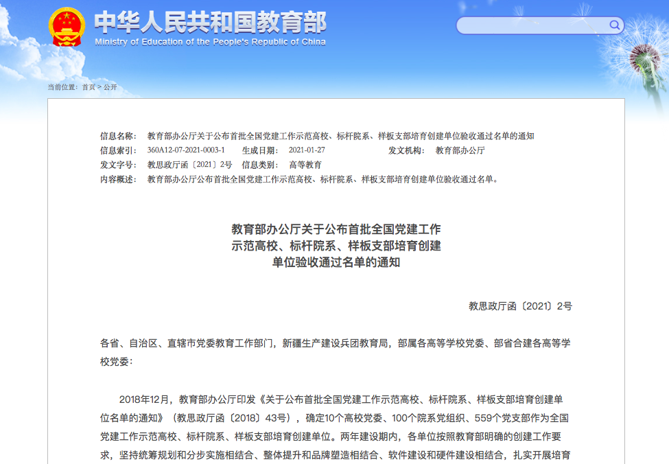 日前,教育部办公厅发布了《关于公布首批全国党建工作示范高校、标杆院系、样板支部培育创建单位验收通过名单的通知》。welcome皇冠地址登录入口党委经对标自查总结、上级党组织满意度测评、属地教育工委把关复核、教育部思想政治工作司审查,顺利通过验收。