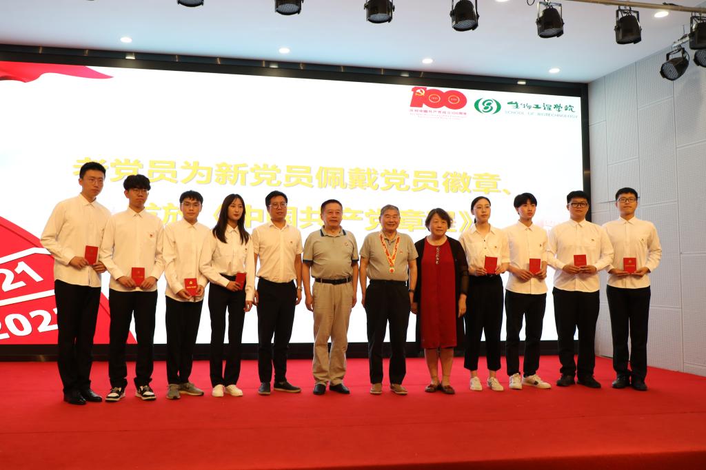 仪式在庄严的《国际歌》中拉开帷幕,周云龙宣读新发展预备党员名单并与关工委老师们为2021年新党员代表佩戴党员徽章。由吴骥一领誓,160位预备党员举起右拳,慷慨激昂,在党旗下光荣宣誓。随后,来自酿酒1901班新发展的预备党员郎绪涛代表全体学生党员发言,同时向党组织承诺:严格以党员的标准要求自己,鞭策自己,一颗红心跟党走,逐梦青春正当时!活动当日是七七事变爆发84周年。84年前,无数中华儿女不顾生死,为保卫河山浴血奋战。在场师生有感而发,全体默哀,致敬先辈不屈的抗争。随后,来自酿酒1802班的张欣怡、基地1801班的杨若青和发酵1902班的马俊,结合学院开展的“千里行——党史学习宣讲团”、“百名学生党员走访百名老党员”等活动,声情并茂,充满自豪地分享了自己与党的故事。在高涨的热情中,周云龙和张星元以嘹亮的歌声带领全场党员们唱响《没有共产党就没有新中国》,歌声在会场久久回荡,现场气氛十分热烈。最后,诸葛健开展了题为“不忘初心 坚持信仰 立足本职”主题微党课,给同学们讲述了他的入党初心和使命担当,在场青年党员深有感触,进一步认识到加入党组织是一种政治选择,也是一种精神追求和人生价值的承诺,最后他寄语新党员:国家的希望寄托在你们身上!努力吧,年轻人!