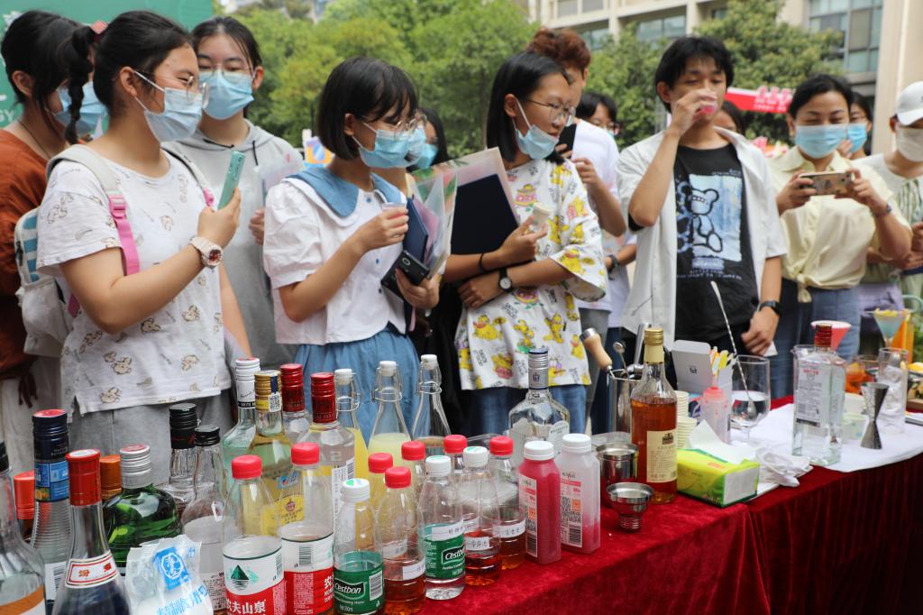 迎新现场的学科文化互动体验区热闹非凡。“调酒-品酒-讲酒”沉浸式的文化互动带给新同学生动真切的学科文化初体验,酒品种类缤纷、现场气氛热烈,“善于实践,勇于创新”的发酵精神在互动中传递。现场设置的以校史院情为主要内容的线上知识竞答也吸引了不少同学热情参与其中,通过答题互动,新同学们进一步熟悉校园生活、了解院系文化,增强归属感。